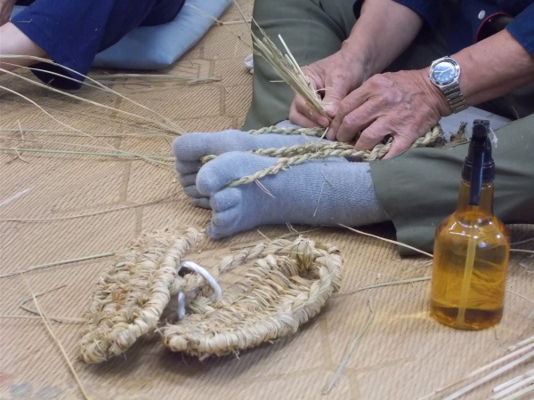 ※わらぞうり作りにご参加の方は、脚を開いて足指を使って編むためズボンスタイルで、わらを切るためのハサミをお持ちください。